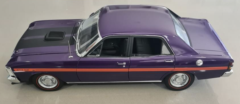 1971 Ford XY Falcon GT (spoiler delete) - ICON Models - Wild Violet with Orange Stripes 1:8